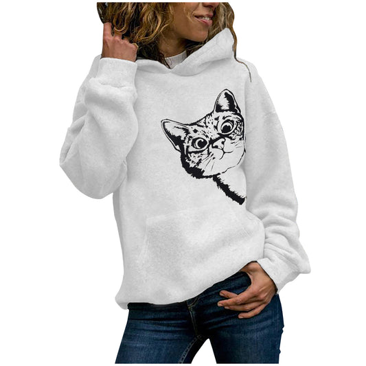 Cozy Chic Cat Pattern Hooded Sweater for Women - Slim Fit Fleece-Lined Leisure Hoodie
